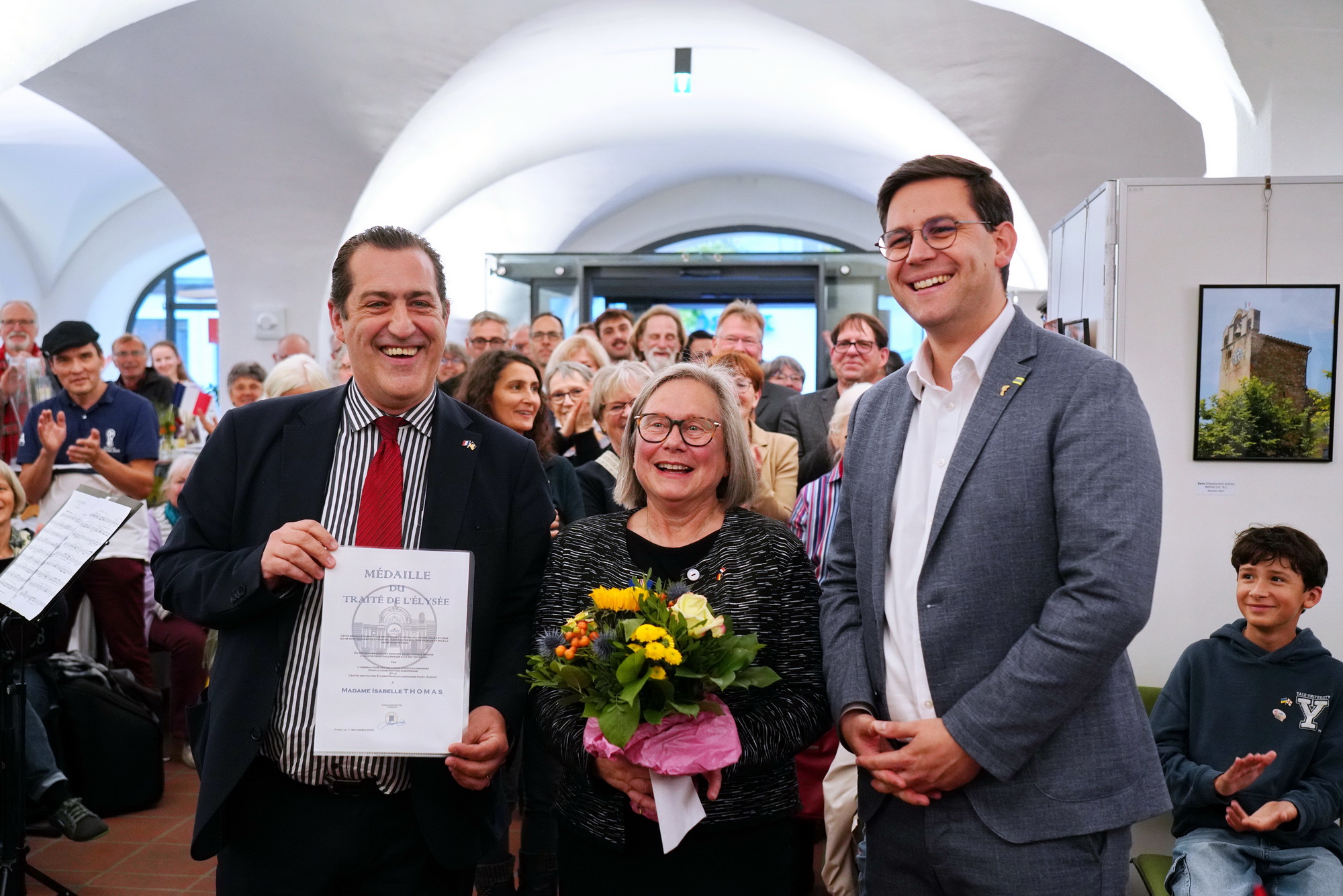 Ein emotionaler Höhepunkt der Veranstaltung war die Ehrung von Frau Isabelle Thomas, die vom französischen Generalkonsul Gaël de Maisonneuve mit der Élysée-Medaille ausgezeichnet wurde – einer der höchsten Auszeichnungen, die Frankreich an Persönlichkeiten vergibt, die sich um die deutsch-französischen Beziehungen verdient gemacht haben.